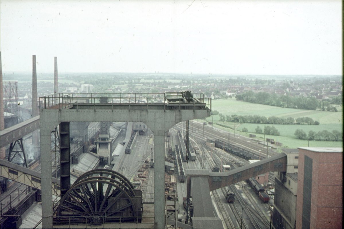 Da sind die Kuhltürme, dort die Aufbereitung, neben uns Schacht III, vor uns liegt die neue, schöne Waschkaue, wo die Kumpels ihren Staub und Dreck abwaschen.